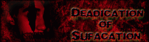 Deadication Of Sufacation .: Click To Enter :. In 2002, he decided to start make music, So, he did, he started off putting samples together with programs such as "Hip Hop Ejay 2" and "Dance 5 Ejay" His first artist names were "Bman","MK47" and "DJ Brawhl", He's was great at making instrumentals with those programs, then a year later he realized. He wanted to more musical stuff. So, he started adding his vocals, his first single with his vocals is "Never Stop Running", didn't really turn out as he thought it would be, but that didn't stop him. He kept on going and going. A year later, He started playing guitar and he was still using samples, So, the songs he made back then were half samples and and half Acoustic guitar. Later that year, He started doing only acoustic recordings and songs, and he started liking it.But he didn't keep "MK47" name because back then he had a band called that but they split but he thought they shared the same name. So, Kevin got to thinking, he had two names in mind "Deadication Of Suffering" Or "Deadication Of Sufacation" and after amount of time he chose "Deadication Of Sufacation" and here he is now. Later on, DOS went on http://www.Icompositions.com and one day he met a guy Named "Boydy" They started a band together with some other people called "Evluation Failure" but that didn't work out because the other people in band weren't on very often. Later on, Boydy and DOS started a band Called 'The Tally Ho". They made songs together but they kind of stoped now. But they still good friends but there make songs together some day. Around Christmas 05', Kevin decided to start his own indie label, he signed a few bands, but it got complicated for him. So he shutted it down and decided to get signed by a label. A month later Kevin joined a band called "Black Ink" but things didn't work. Then Kevin became good friends with solo artist "DC" and they started a band called "Shape-Shifters". But then they found out that name was tooken so they made the band "Yesterdays Tears" They made one track called "My Last Days". Sadly the band broke up because Kevin and the other band mate didn't have the same styles of music. As for time being Kevin is hoping to get signed by EAE Records. |